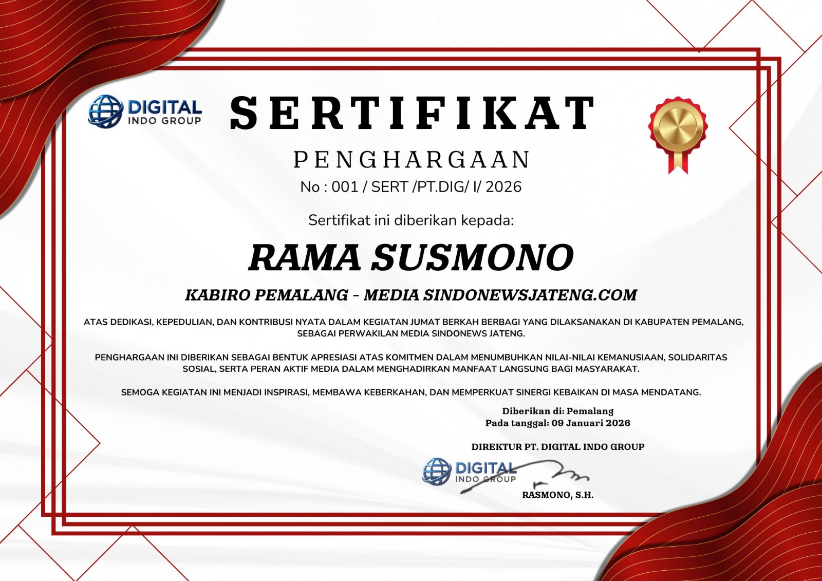 Purbalingga, KABAR INDONESIA — Direktur Utama PT Digital Indo Group, RASMONO, S.H, menyampaikan ucapan Selamat Malam Nisfu Sya’ban 1447 Hijriah…